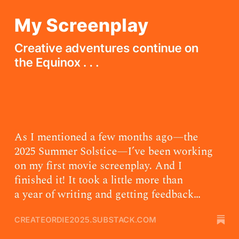 My Screenplay September 29, 2025 — by Harald Leave a Comment https://open.substack.com/pub/createordie2025/p/my-screenplay?r=3ot69p&utm_campaign=post&utm_medium=web&showWelcomeOnShare=true